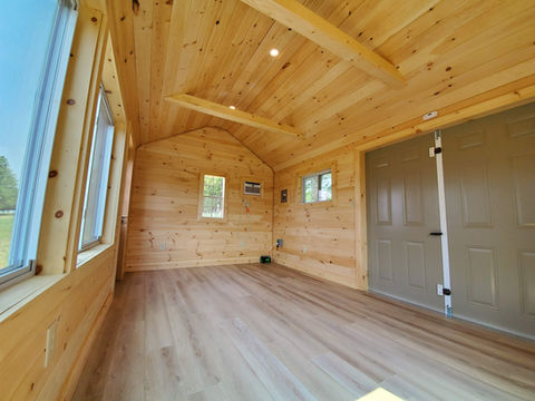 Here is a shed on the top of a remote hill. The client plans to use it as a writing room. All the ceilings and walls are finished with a 6" tongue and groove board, and the flooring is LVP. The client has a neat portable battery pack, so we wired up a spot for them to connect it to the service panel inside the shed. Not something you see everyday!