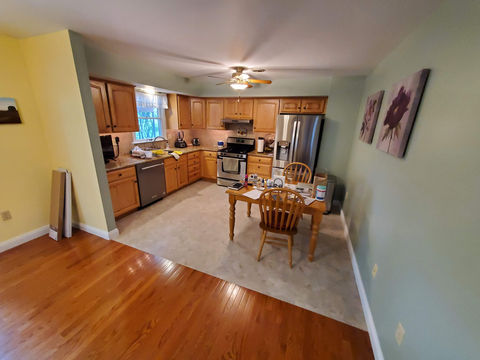 These home owners decided to remove and dispose of their existing drop ceiling and lights (not pictured here) and upgrade to a drywall ceiling. We saved the existing flooring and painted the walls an owner selected color. The owners elected to finish up by installing the base trim and casing as a weekend project. What a difference!